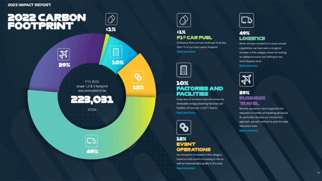 Los cambios vienen impulsados por la agenda verde que la F1 quiere implantar con su “Net Zero 2030”, con la que quiere una huella de carbono en 0 para ese año – por muy absurdo que parezca que una competición que se mueve a 24 países en 12 meses con todo su equipamiento y personal y se dedica a las carreras de coches quiera “no contaminar” –. Lo cual es gracioso, puesto que solo el 1% de las emisiones de CO2 en F1 procede de las carreras. siendo el 99% restante producido por todo lo que rodea a la F1 (envío de coches, movimiento de personal y material…). Aunque el tema del clima y el CO2 ya será objeto de otro artículo.